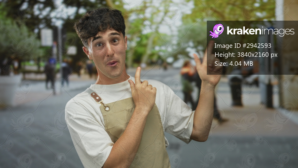 Man pointing with both hands and smiling on street with blurred pedestrians and trees; playful.