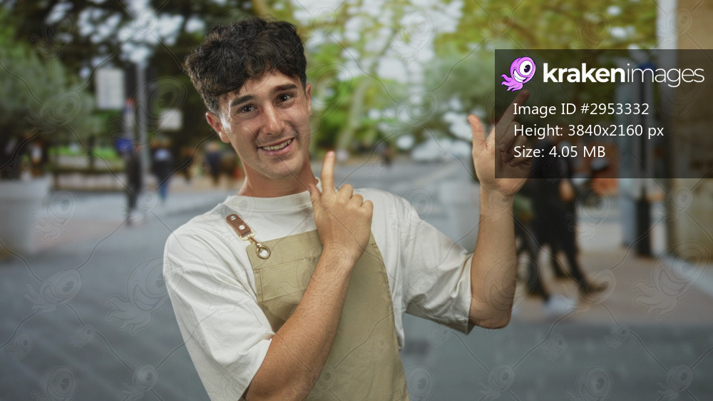 Man pointing with both hands and smiling on street with blurred pedestrians and trees; playful.