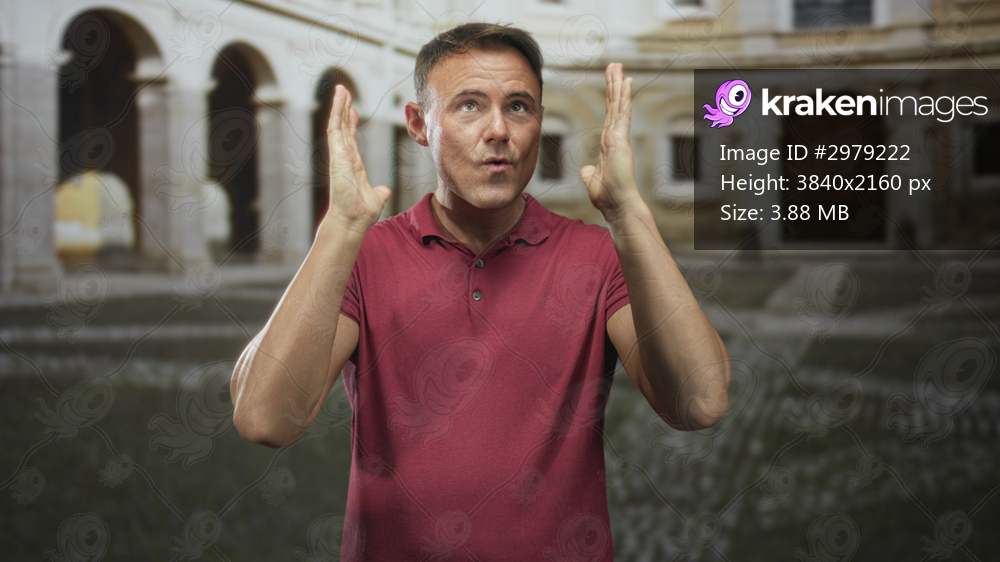 Man pointing both index fingers with bare hands toward camera inside building courtyard with stone arches and cobblestone plaza; playful confidence.
