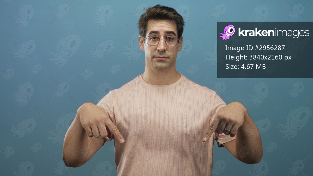 Man pointing both index fingers downward with visible hands and neutral expression in studio; hesitation doubt.