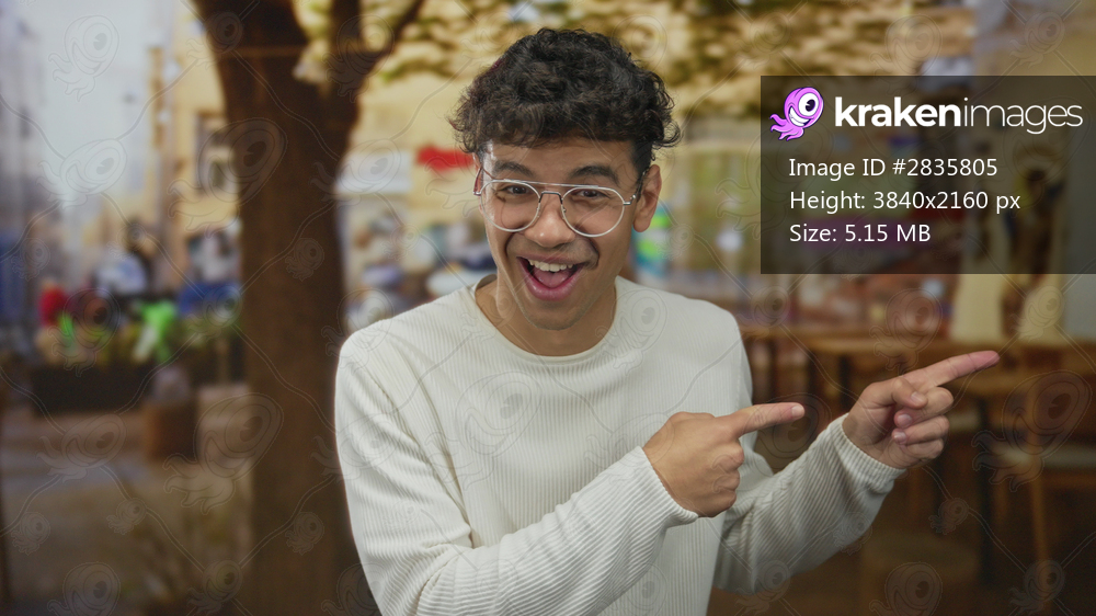 Man pointing both index fingers to the right on building terrace with wooden tables and blurred diners; surprise reaction.