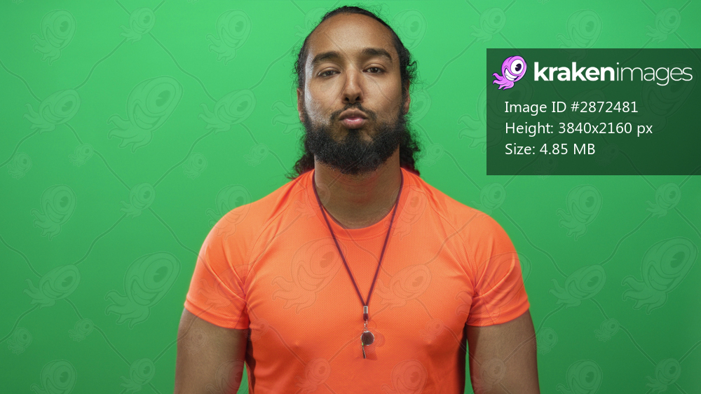Man pointing both index fingers, wearing an orange shirt and a whistle against a green studio screen, hands and forearms visible; focus instruction.