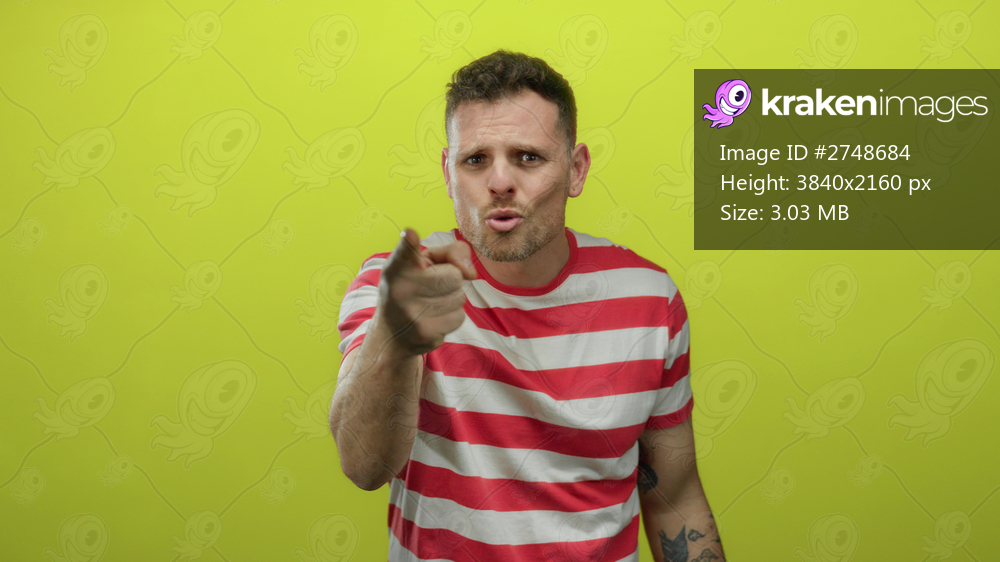 Man pointing confidently towards camera against bright yellow background wearing striped shirt with tattoos visible on arm suggesting determination focus and engagement - Kraken Images