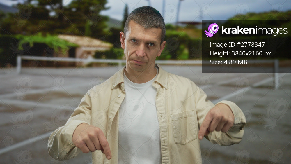 Man pointing down on an outdoor tennis court, showcasing a casual style with green trees in the background under a cloudy sky, conveying focus and determination during a match. - Kraken Images
