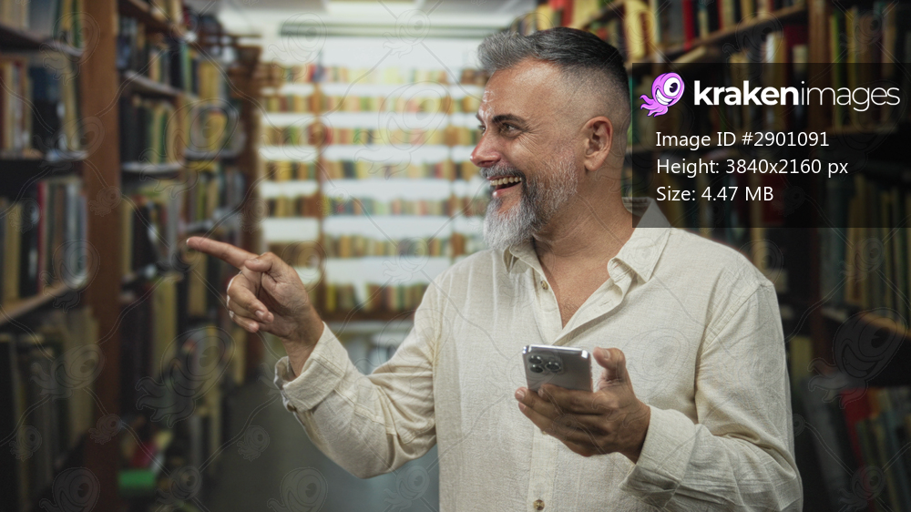 Man pointing finger at bookshelf in library aisle holding smartphone and smiling; curiosity discovery learning.
