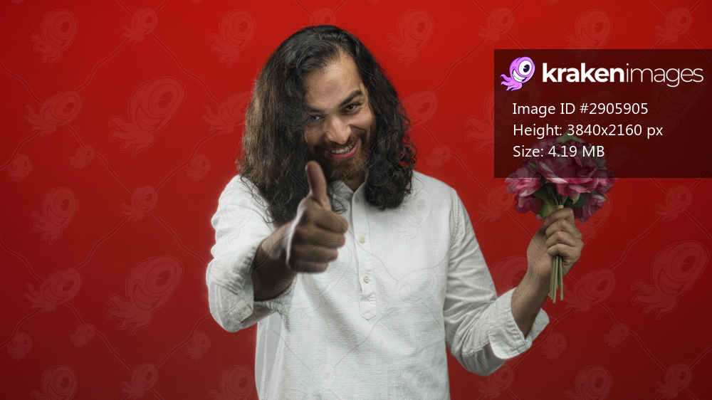 Man pointing finger at bouquet of pink flowers while smiling and holding stems in red studio; playful affection.