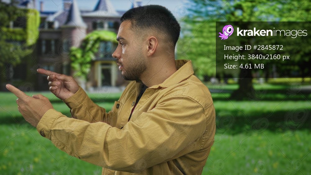Man pointing finger at building entrance through green lawn and tall trees under sunlight; determination.