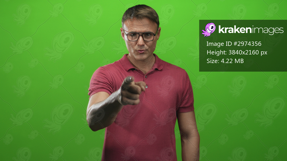 Man pointing finger at camera with hand extended, wearing glasses and red polo shirt in studio; assertive challenge.
