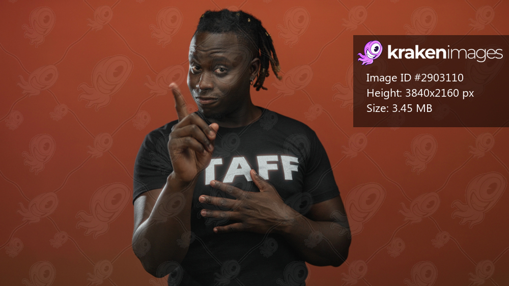Man pointing finger at camera with hand on chest, wearing staff t shirt in orange studio setting; warning.