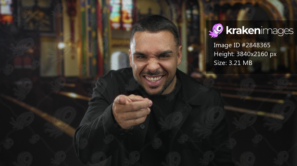 Man pointing finger at camera in building aisle with stained glass windows and wooden pews; welcoming faith.