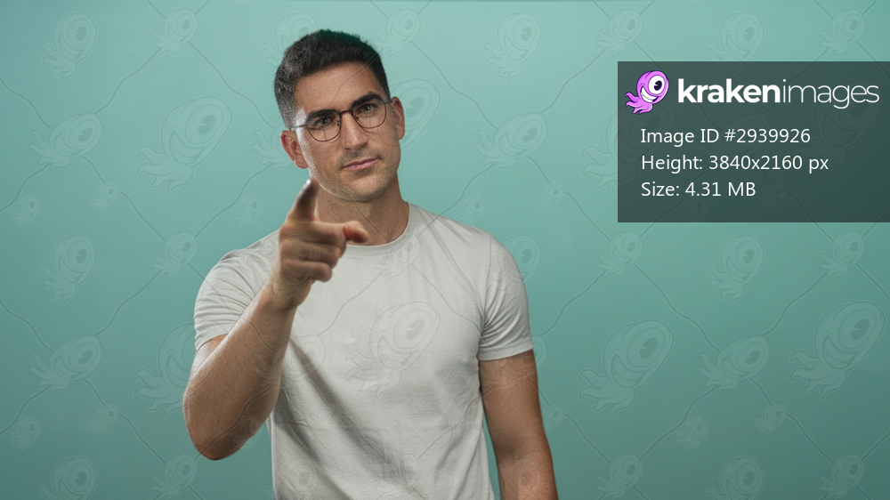 Man pointing finger at camera in studio against teal wall, wearing glasses and white tshirt; confidence.