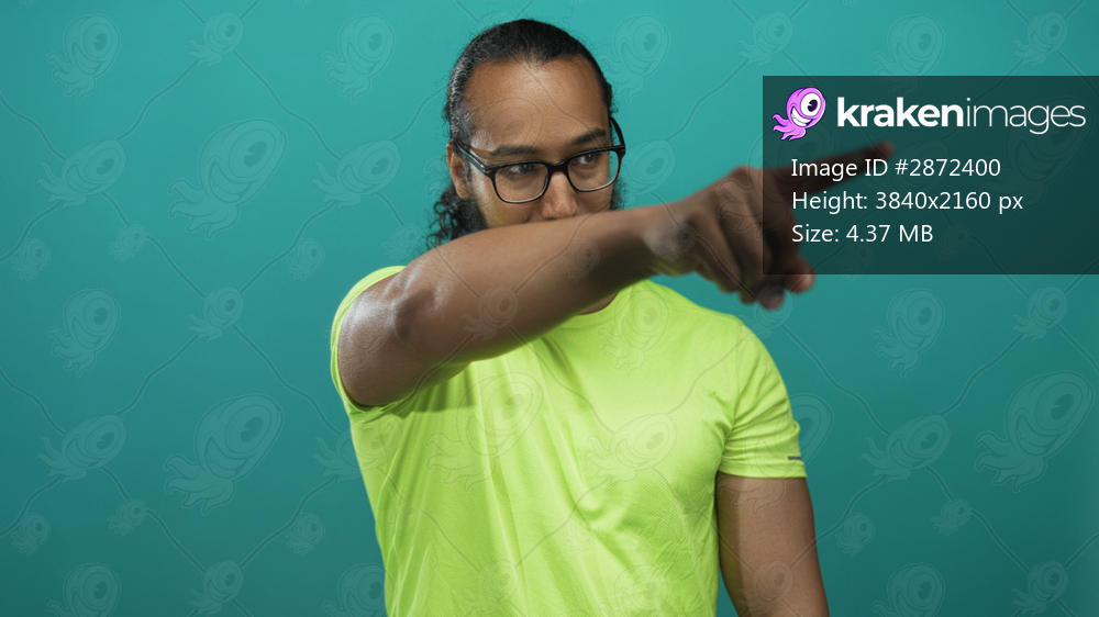 Man pointing finger at camera in studio with teal backdrop wearing neon green shirt; confidence focus resolve.