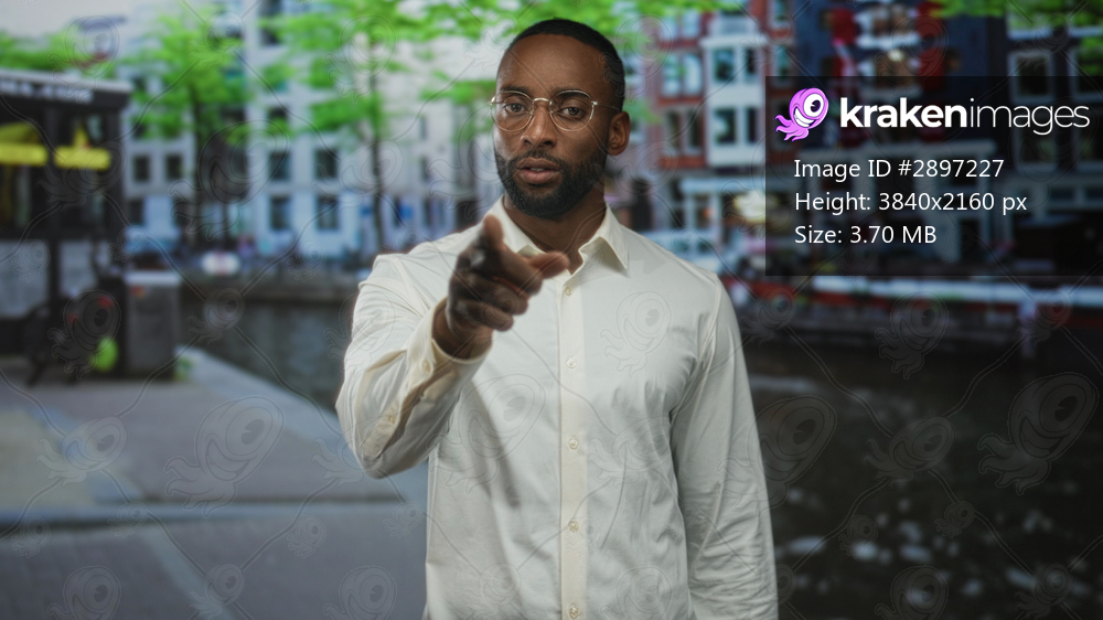 Man pointing finger at camera on amsterdam street by canal water wearing white shirt and glasses; quiet confidence.