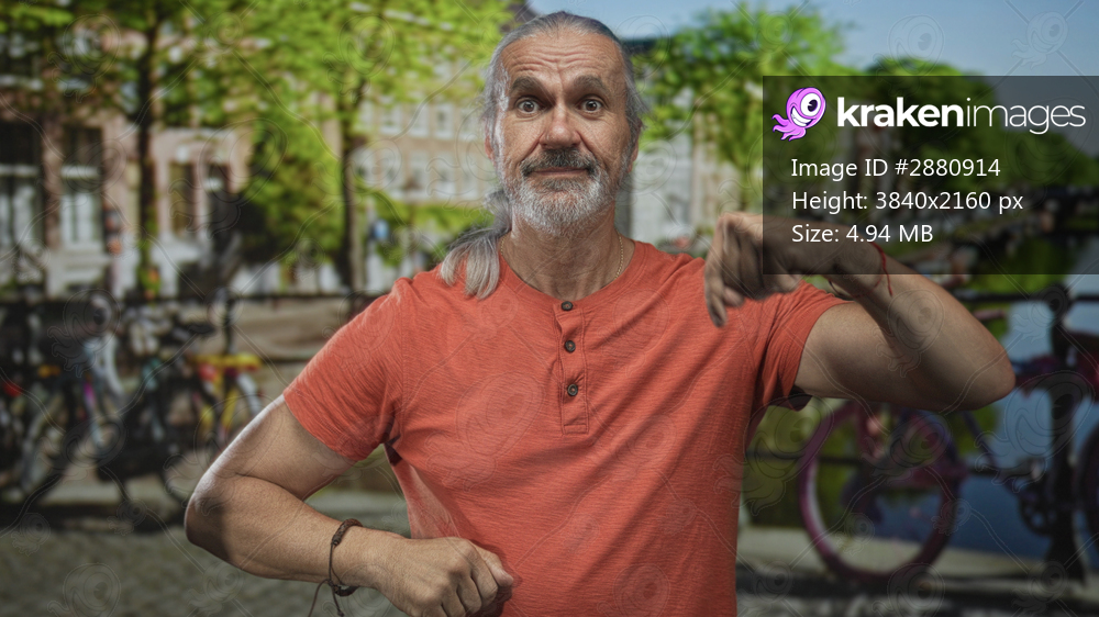 Man pointing finger at camera on street near amsterdam canal bridge, smiling with long hair and beard; cheerful curiosity.