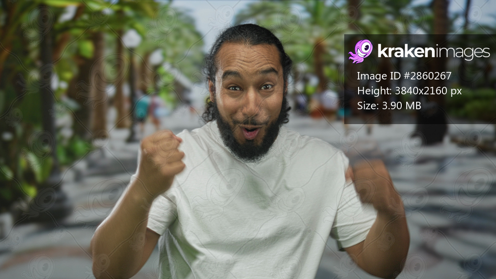 Man pointing finger at camera on street with pointing hand and open mouth expression; joy victory celebration.