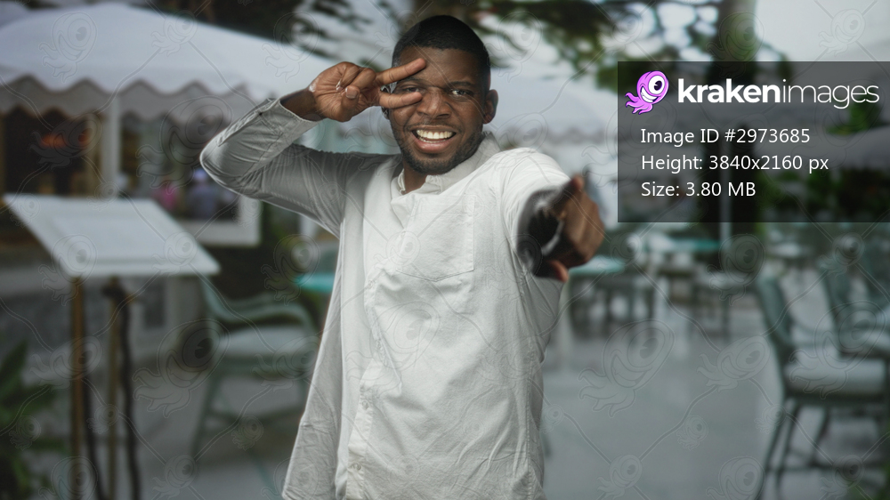 Man pointing finger at camera with one hand and flashing peace sign with the other amid outdoor cafe umbrellas on a street; joy connection.
