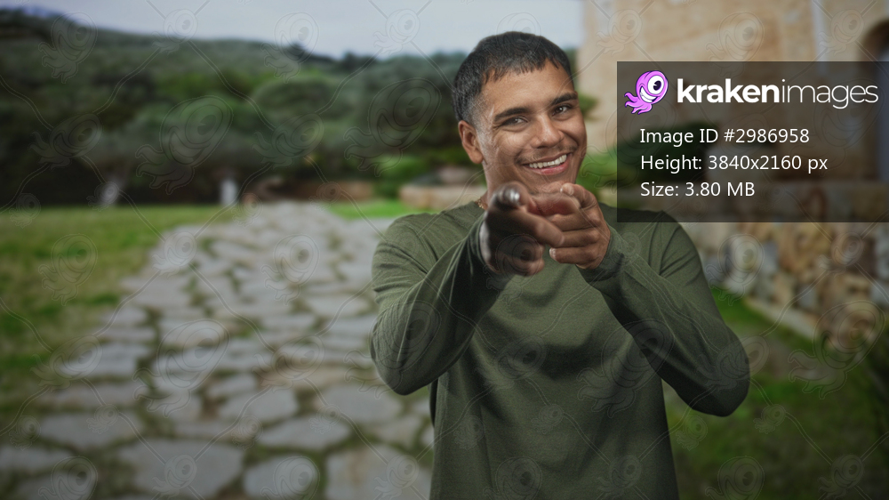 Man pointing finger at camera with visible hands and smiling on a cobblestone path by a stone building, in a casual green shirt; joy approachable friendly. - Kraken Images