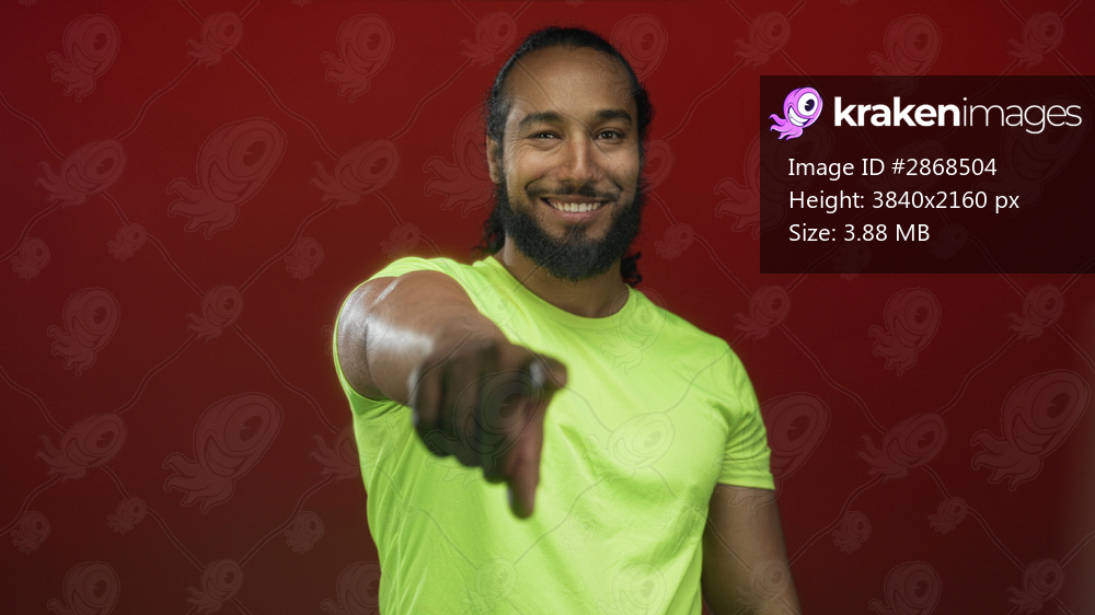 Man pointing finger at camera with visible smile and neon green shirt in red studio; confidence invitation motivation outreach.