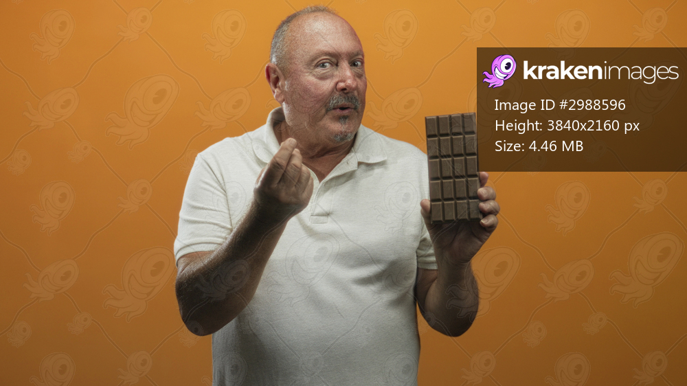 Man pointing finger at chocolate bar held in hand in studio, senior hispanic wearing white polo against orange backdrop; playful temptation.