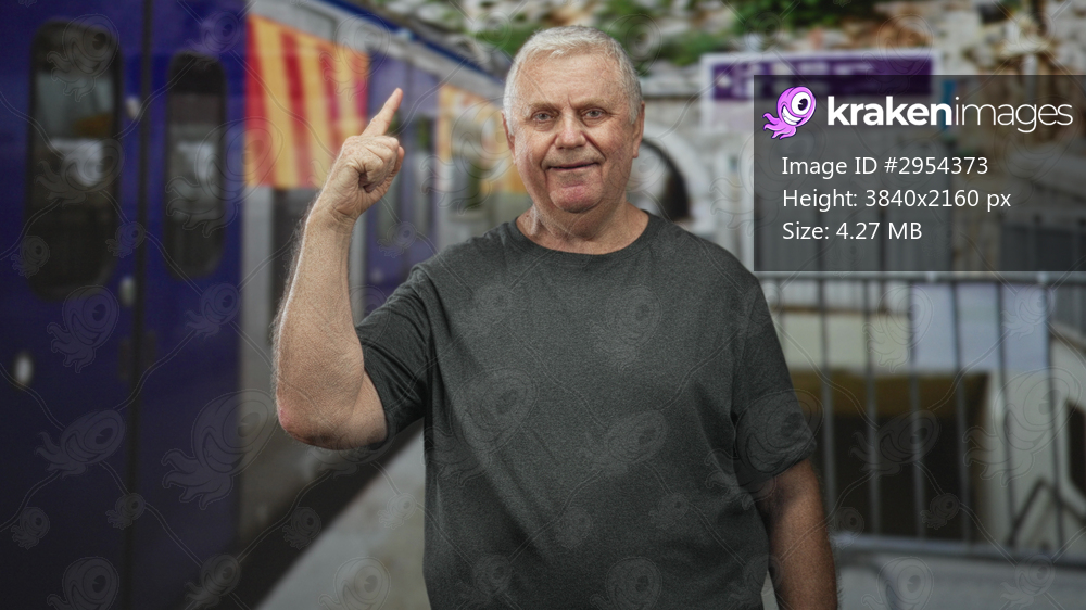 Man pointing finger at train platform inside building, forearm exposed and gray shirt, slight smile; curiosity travel discovery.