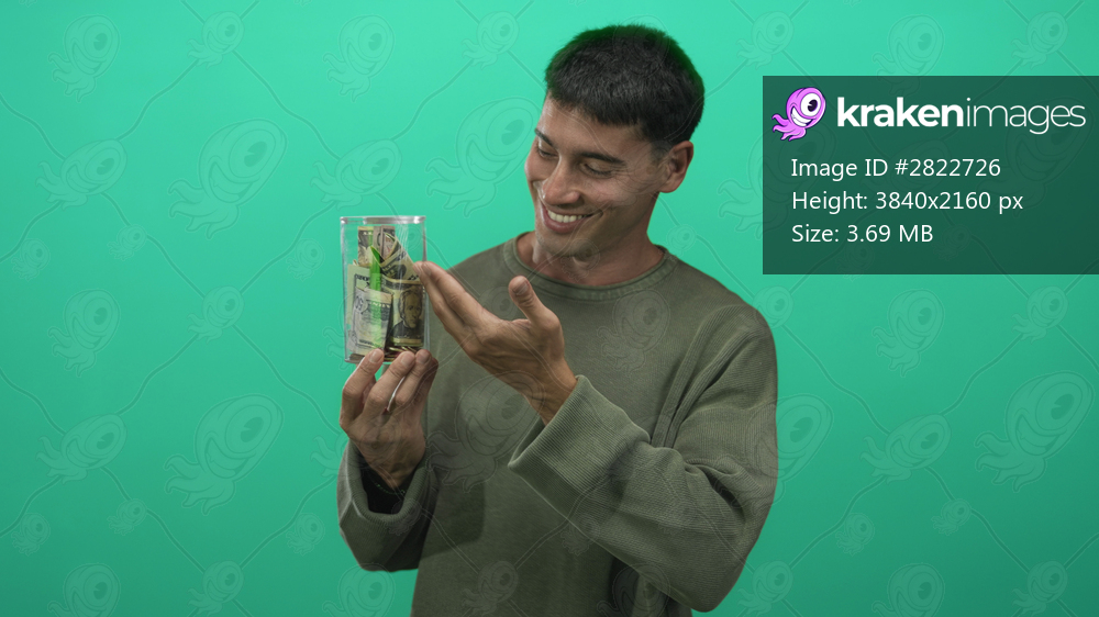 Man pointing finger at transparent jar filled with banknotes in green studio setting; financial ambition.