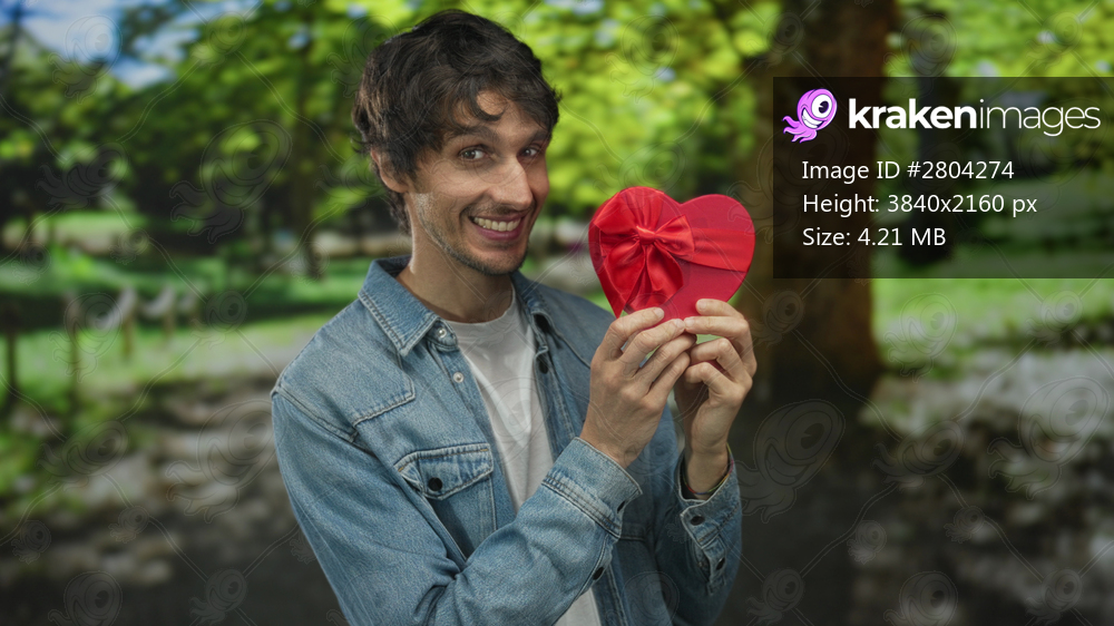 Man pointing finger at viewer while holding red heart shaped gift box in forest on a sunny day; love offering romance.