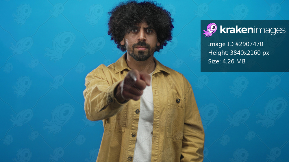 Man pointing finger directly at camera in bright blue studio with curly hair and neutral shirt; authority confrontation determination.