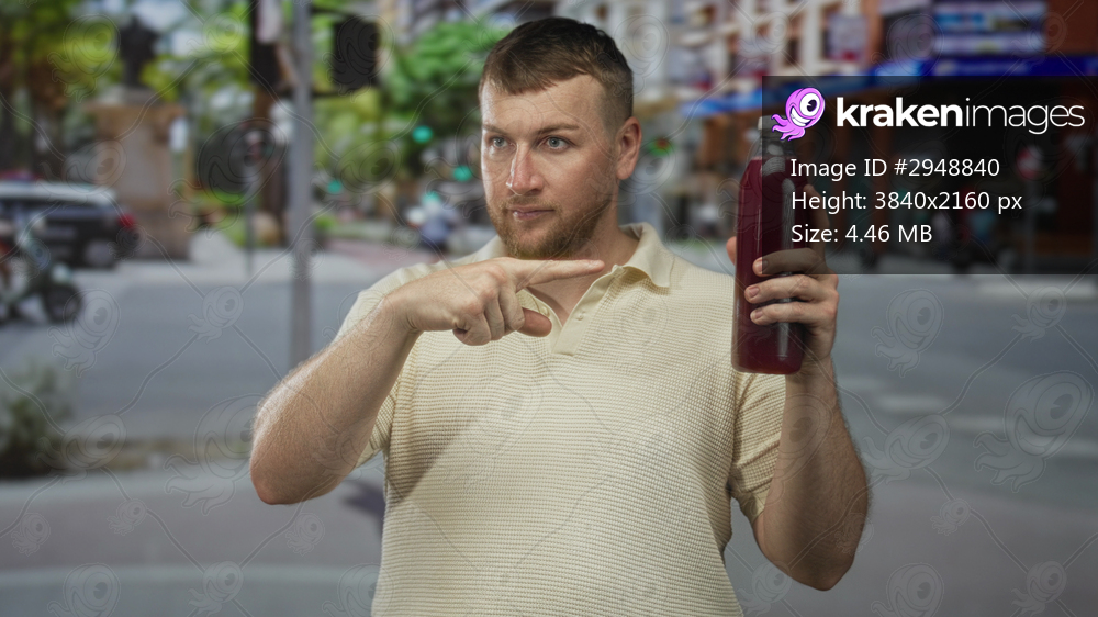 Man pointing finger and holding a bottled drink on a street with city buildings and blurred traffic, bare forearm visible; product promotion curiosity. - Kraken Images