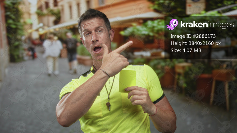 Man pointing finger and holding a yellow card on a busy street terrace outside a restaurant, whistle visible at neck; warning discipline.
