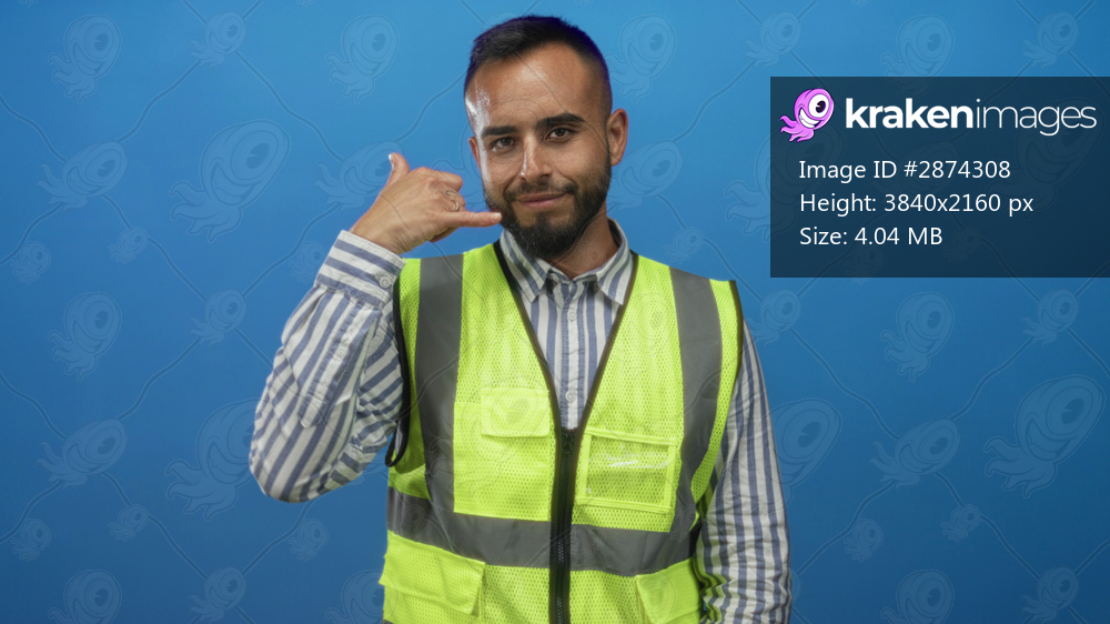 Man pointing finger in studio wearing reflective safety vest as engineer against blue backdrop; confidence recruitment.
