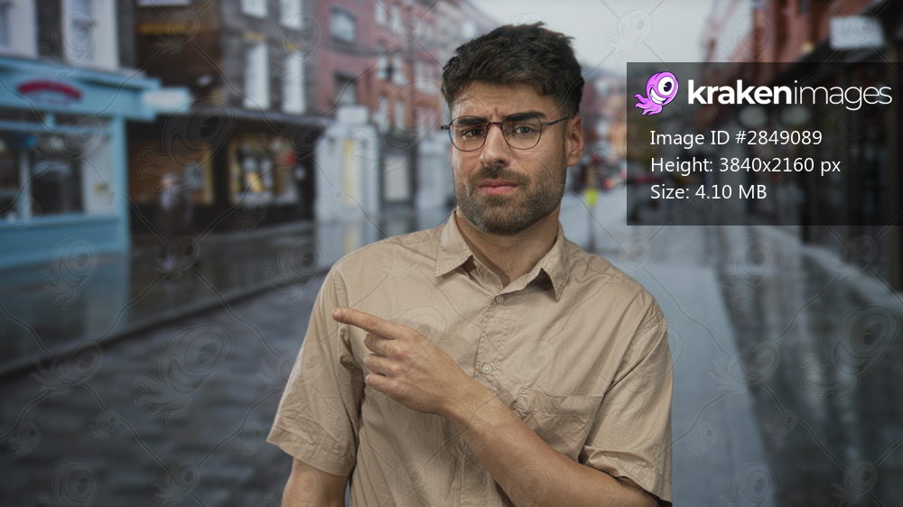 Man pointing finger on wet city street under overcast sky near storefront windows at dawn; curiosity.