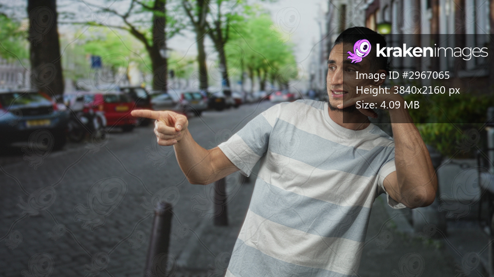 Man pointing finger with right hand on a narrow urban street, wearing blue striped tshirt, standing by bicycle racks and stone bollards; playful.