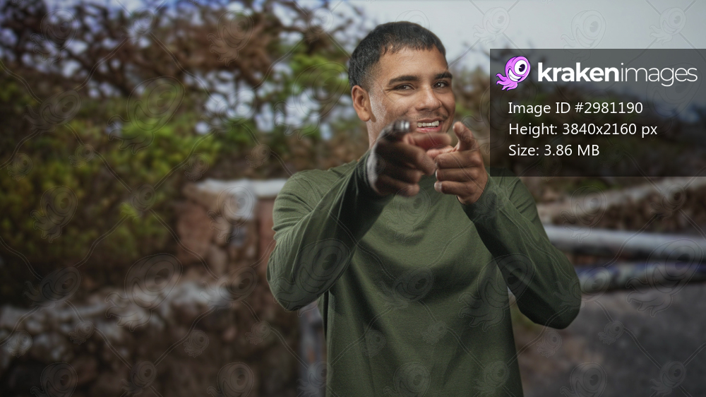 Man pointing finger and showing hands on street beside a stone wall, smiling and wearing a green long sleeve shirt; friendly playful.