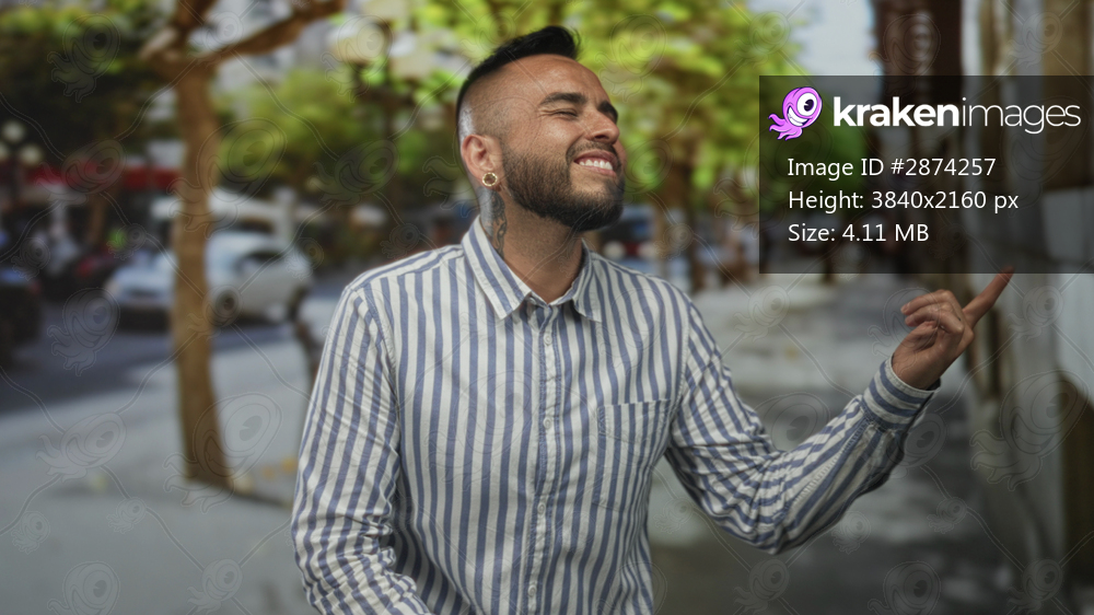 Man pointing finger and smiling with tattooed neck and striped shirt on street in city scene; carefree joy.