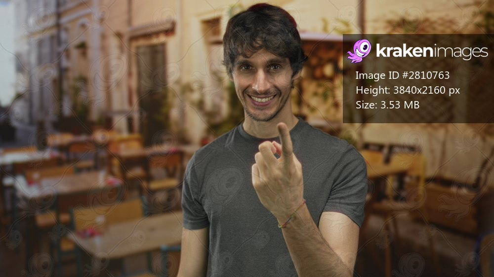 Man pointing finger with smiling wink in sunlit restaurant terrace near wooden tables; playful invitation.