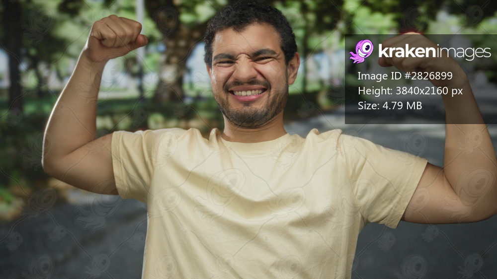 Man pointing finger to bicep muscle while flexing arm under sunlit trees in forest walkway; pride strength.