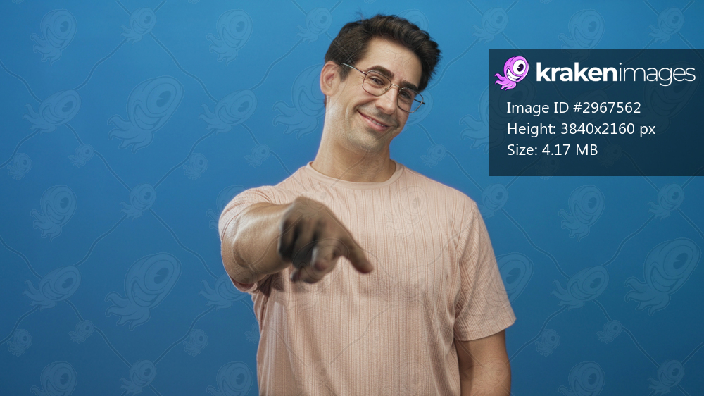 Man pointing finger to camera in studio with smiling face and glasses wearing pink tshirt; playful confidence.