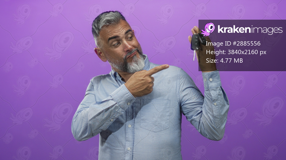 Man pointing finger to car keys while holding key fob and smiling, standing in purple studio; confidence car sale.