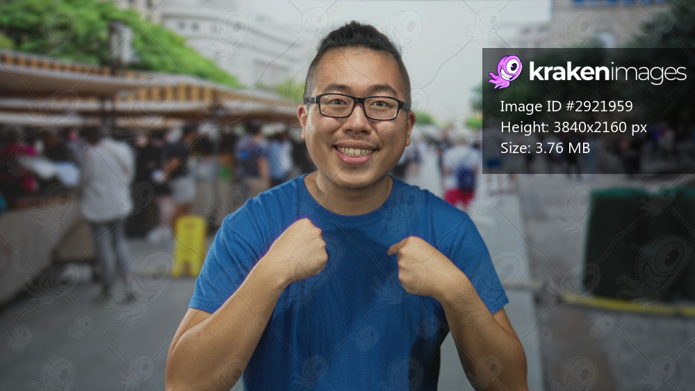 Man pointing finger to chest at crowded street market, bare forearms visible, wearing blue t shirt and glasses, smiling broadly; confidence pride.