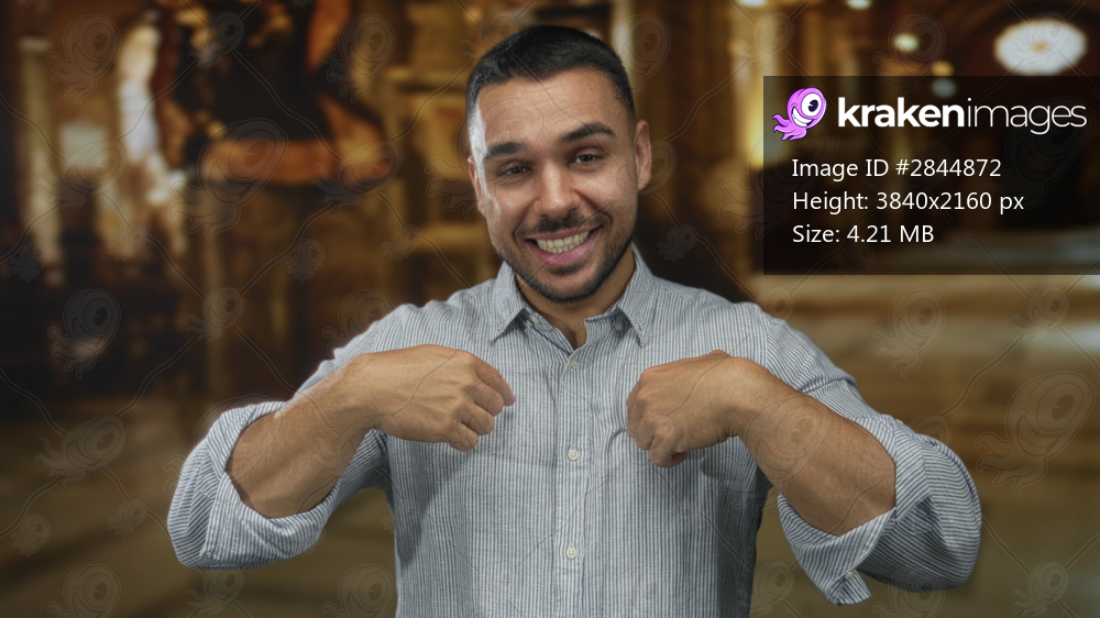 Man pointing finger to chest with hands in a church building, smiling broadly amid architecture; devotion.