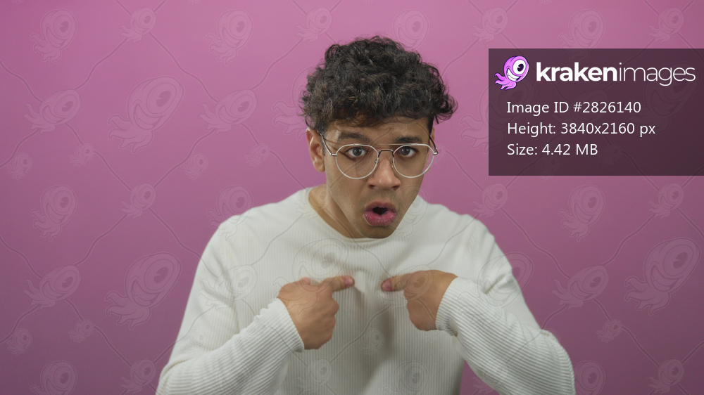 Man pointing finger to chest with open mouth and raised eyebrows in pink studio; surprise accusation.