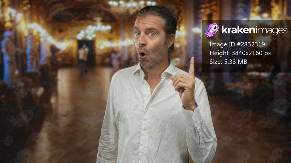 Man pointing finger to marble statue in grand ornate gallery room with sculpted columns and polished marble floor; curiosity.