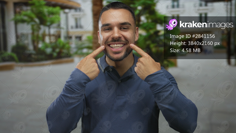 Man pointing finger to mouth and flashing a wide smile in an outdoor street setting with leafy plants and building facade behind him; confidence.