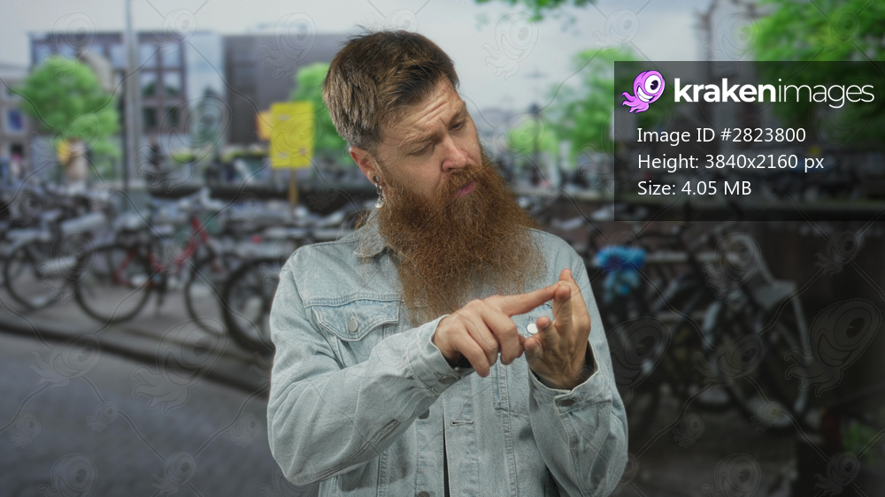 Man pointing finger to palm in bike rental parking on urban street, denim jacket visible; concentration.