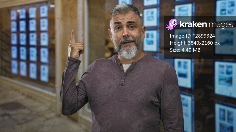 Man pointing finger to property display in building window while smiling and gesturing at real estate listings inside showroom; confidence sales pitch. - Kraken Images