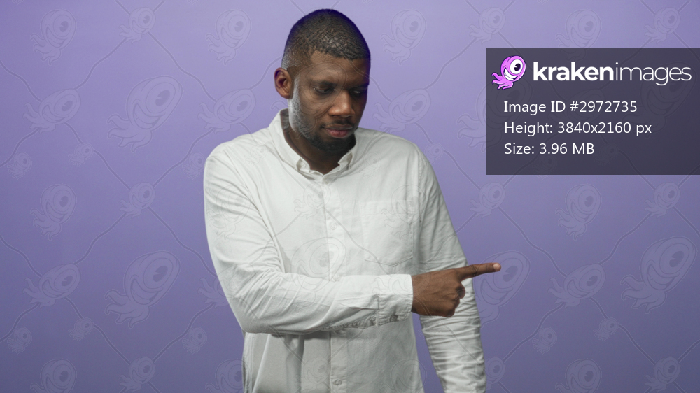 Man pointing finger to right in studio wearing white button shirt against purple backdrop, looking down and gesturing with arm; focused instruction.