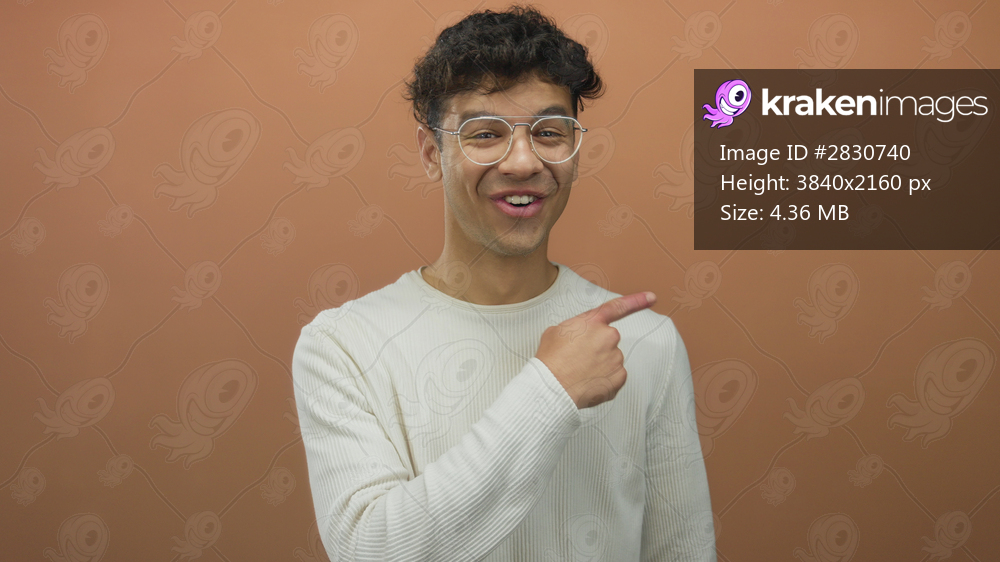 Man pointing finger to side against orange studio wall wearing white sweater and glasses; excitement.