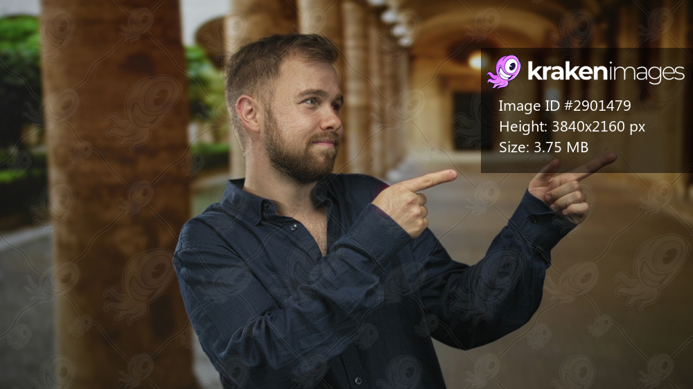 Man pointing finger to side on a street in an old town wearing a navy shirt and smiling with a short beard; friendly invite.