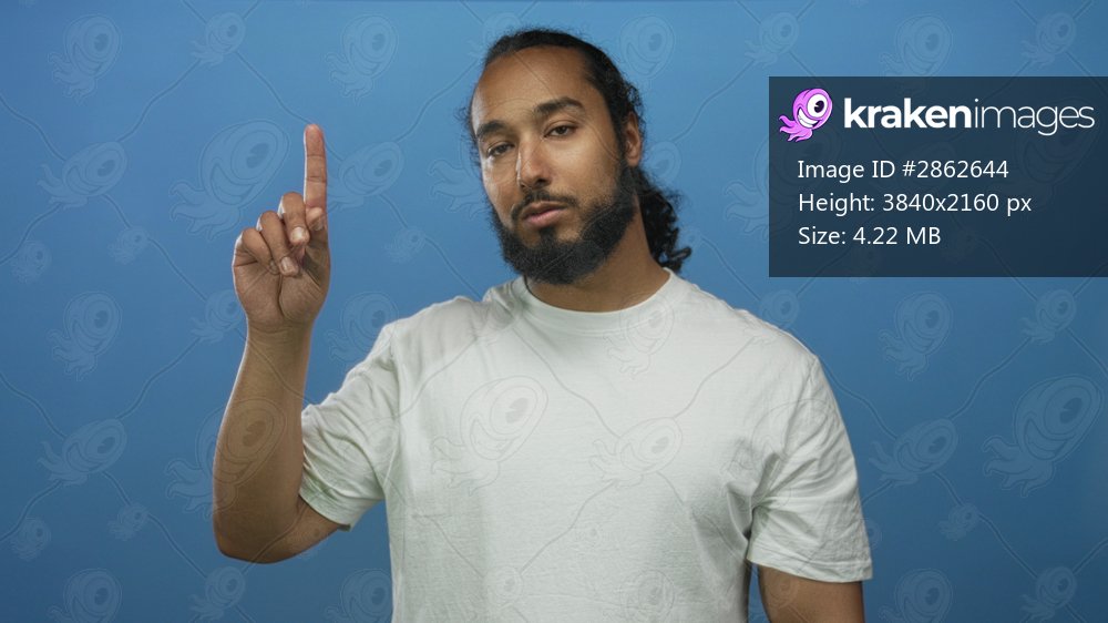Man pointing finger to the left in a blue studio wearing white t shirt and beard, raising index finger as a clear gesture of instruction; confidence.