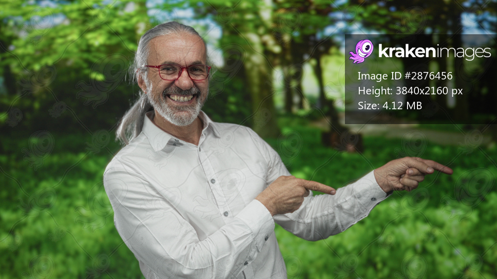 Man pointing finger to the right in forest path, smiling and wearing white shirt and red glasses; joy invitation.